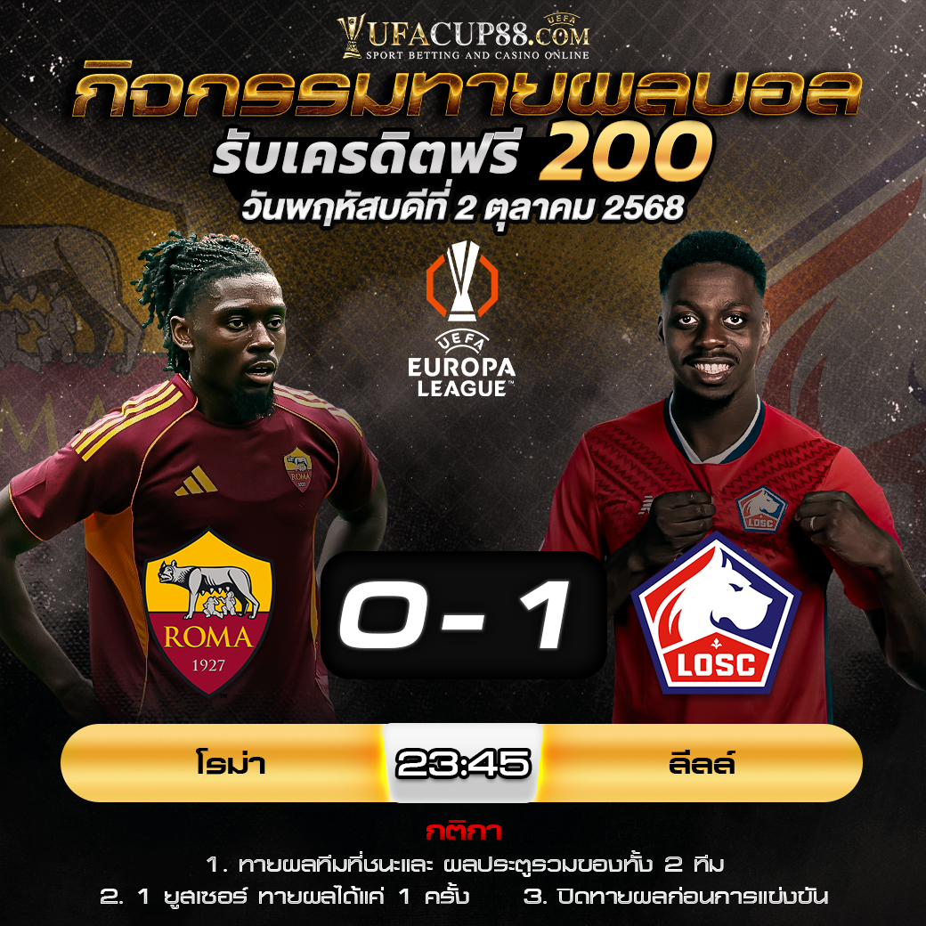 ประกาศกิจกรรมทายสกอร์รวมและทีมไหนจะชนะคู่ โรม่า 0-1 ลีลล์ ประจำวันที่ 2 ตุลาคม 2568