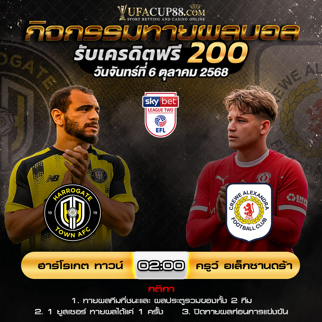 กิจกรรมทายสกอร์รวมและทีมไหนจะชนะคู่ ฮาร์โรเกต ทาวน์ VS ครูว์ อเล็กซานดร้า ประจำวันที่ 6 ตุลาคม 2568