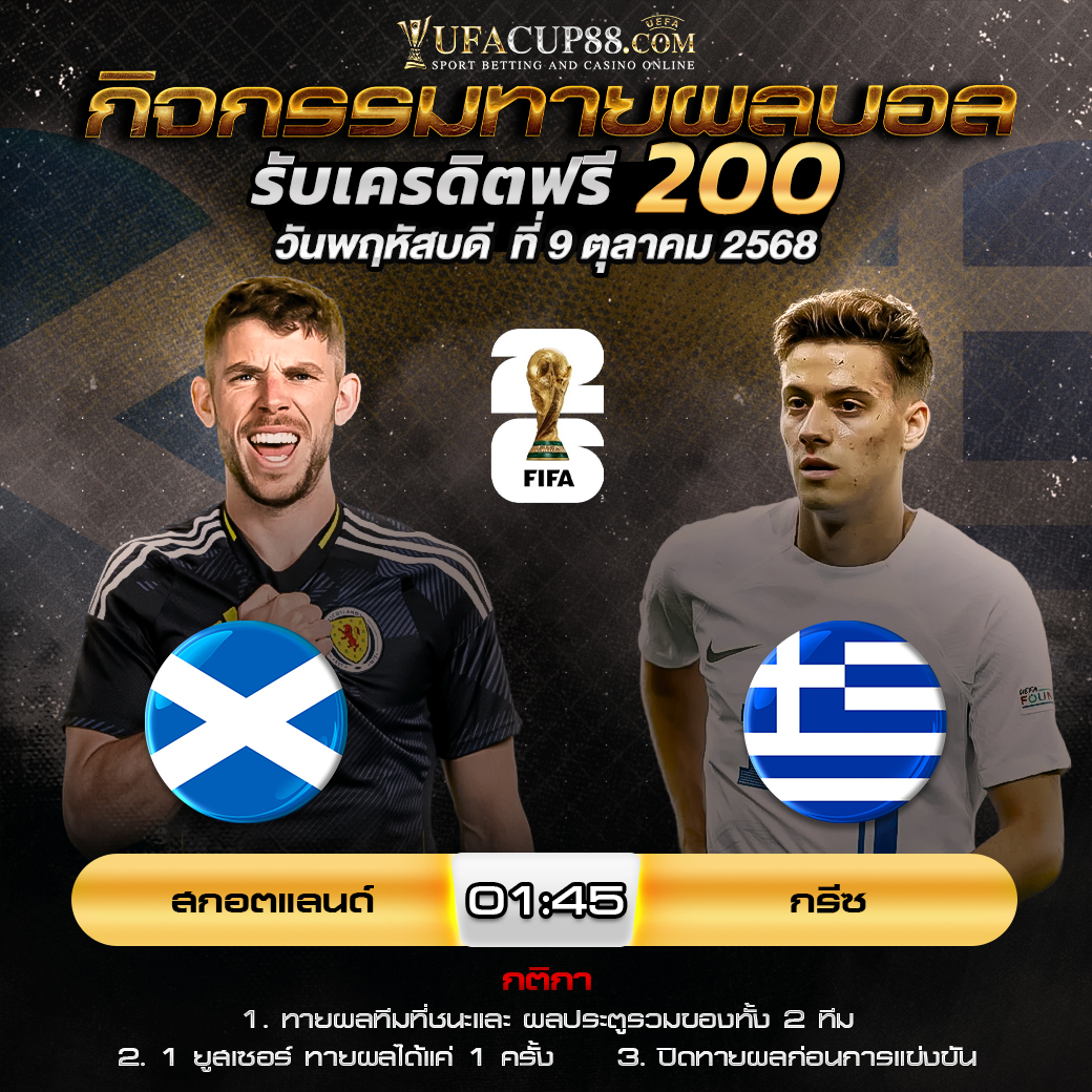 กิจกรรมทายสกอร์รวมและทีมไหนจะชนะคู่ สกอตเเลนด์ VS กรีช ประจำวันที่ 9 ตุลาคม 2568