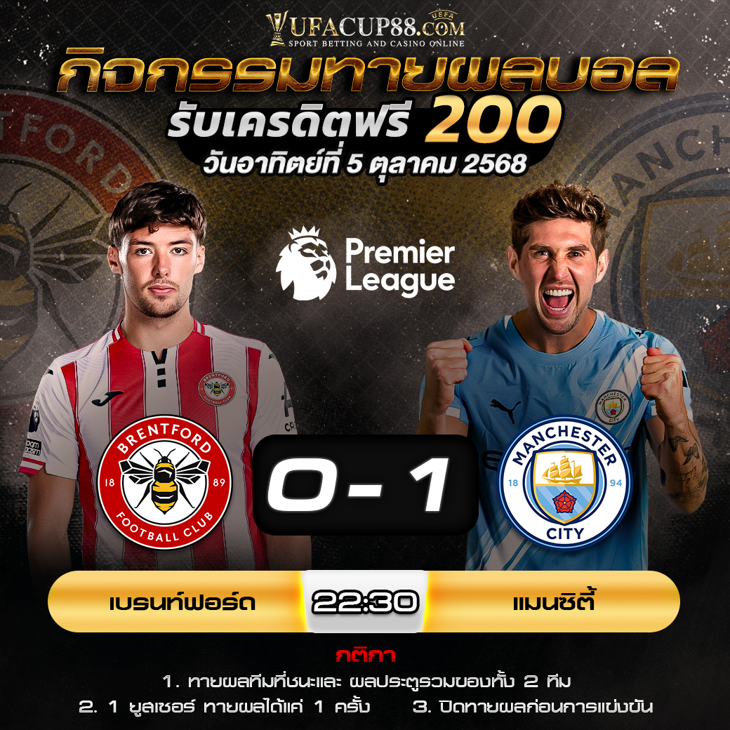 ประกาศกิจกรรมทายสกอร์รวมและทีมไหนจะชนะคู่ เบรนท์ฟอร์ด 0-1 แมนซิตี้ ประจำวันที่ 5 ตุลาคม 2568