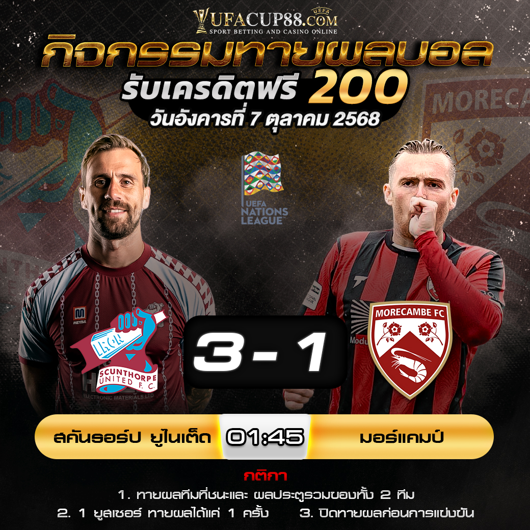 ประกาศกิจกรรมทายสกอร์รวมและทีมไหนจะชนะคู่ สคันธอร์ป ยูไนเต็ด 3-1 มอร์แคมป์ ประจำวันที่ 7 ตุลาคม 2568