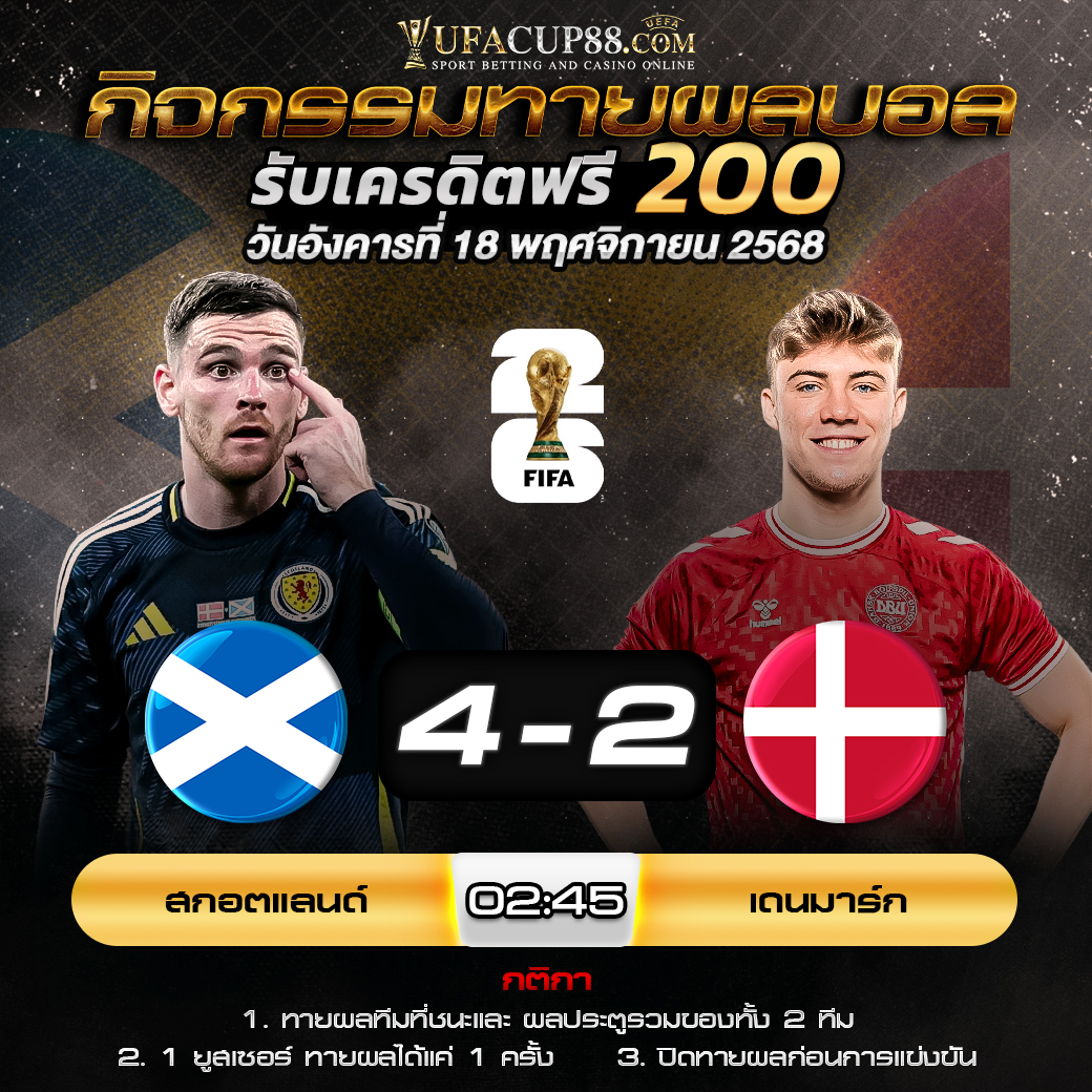 กิจกรรมทายสกอร์รวมและทีมไหนจะชนะคู่ สกอตแลนด์ VS เดนมาร์ก ประจำวันที่ 18 พฤศจิกายน 2568
