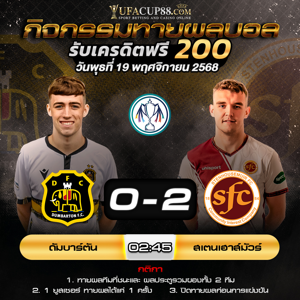 ประกาศกิจกรรมทายสกอร์รวมและทีมไหนจะชนะคู่ ดัมบาร์ตัน 0-2 สเตนเฮาส์มัวร์ ประจำวันที่ 19 พฤศจิกายน 2568