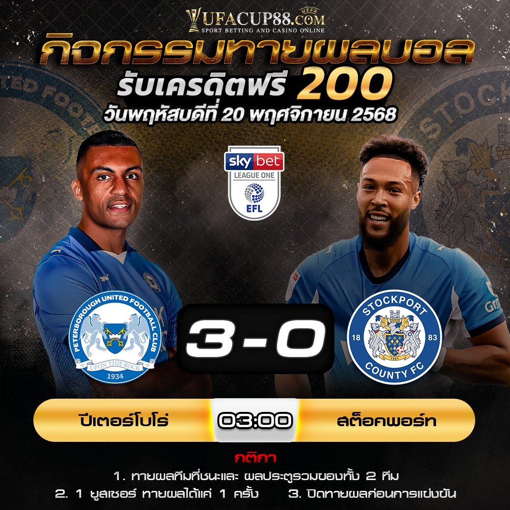 ประกาศกิจกรรมทายสกอร์รวมและทีมไหนจะชนะคู่ ปีเตอร์โบโร่ 3-0 สต็อคพอร์ท ประจำวันที่ 20 พฤศจิกายน 2568
