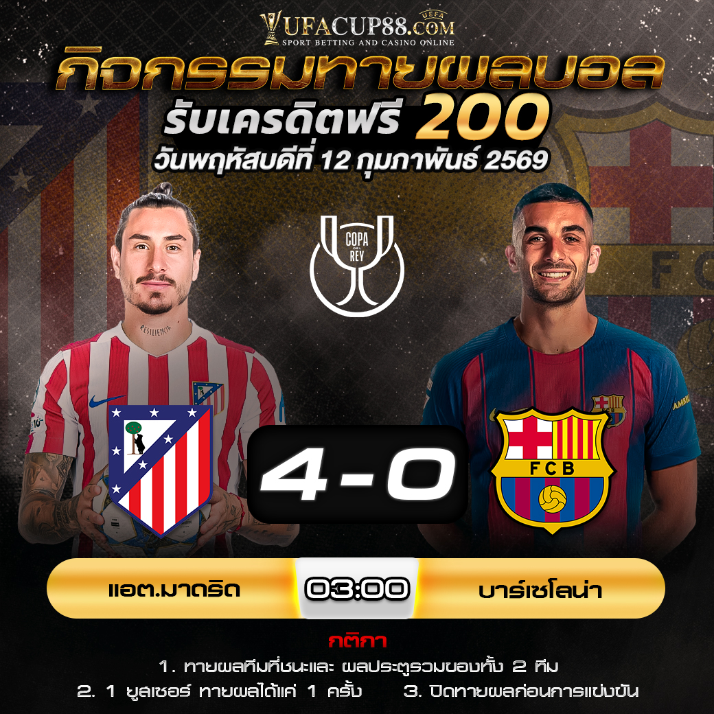 กิจกรรมทายสกอร์รวมและทีมไหนจะชนะคู่ แอตฯ มาดริด VS บาร์เซโลน่า ประจำวันที่ 12 กุมภาพันธ์ 2569