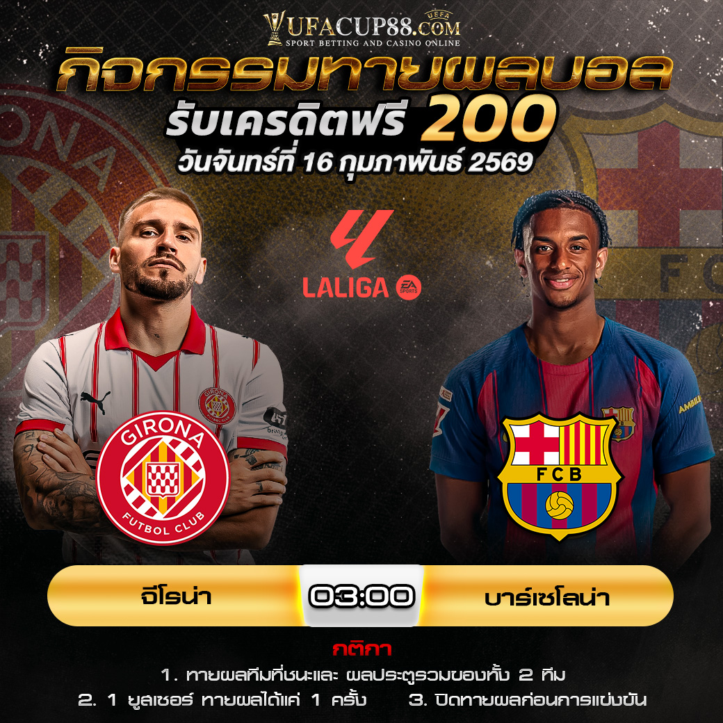 กิจกรรมทายสกอร์รวมและทีมไหนจะชนะคู่ จีโรน่า VS บาร์เซโลน่า ประจำวันที่ 16 กุมภาพันธ์ 2569