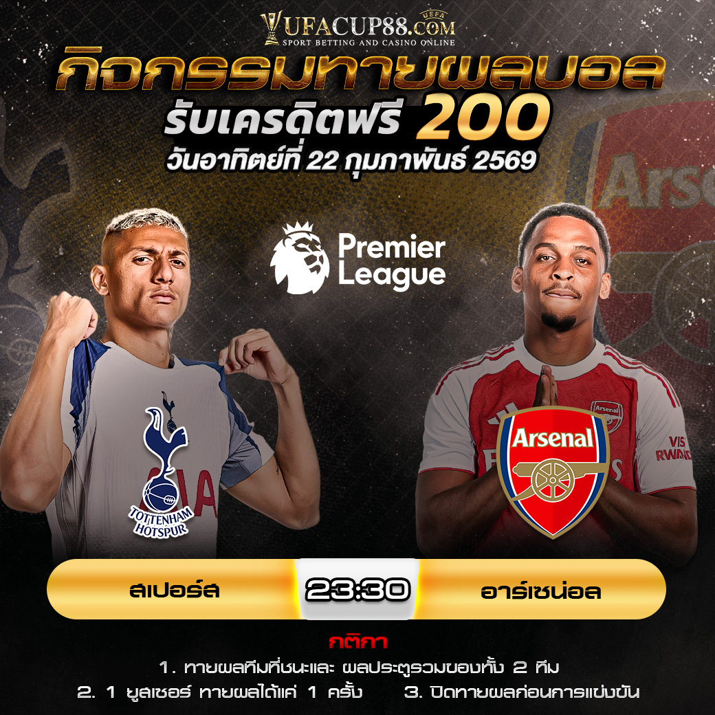 กิจกรรมทายสกอร์รวมและทีมไหนจะชนะคู่ สเปอร์ส VS อาร์เซน่อล ประจำวันที่ 22 กุมภาพันธ์ 2569