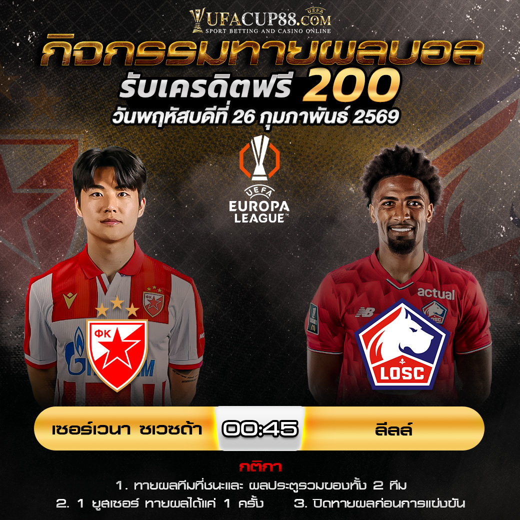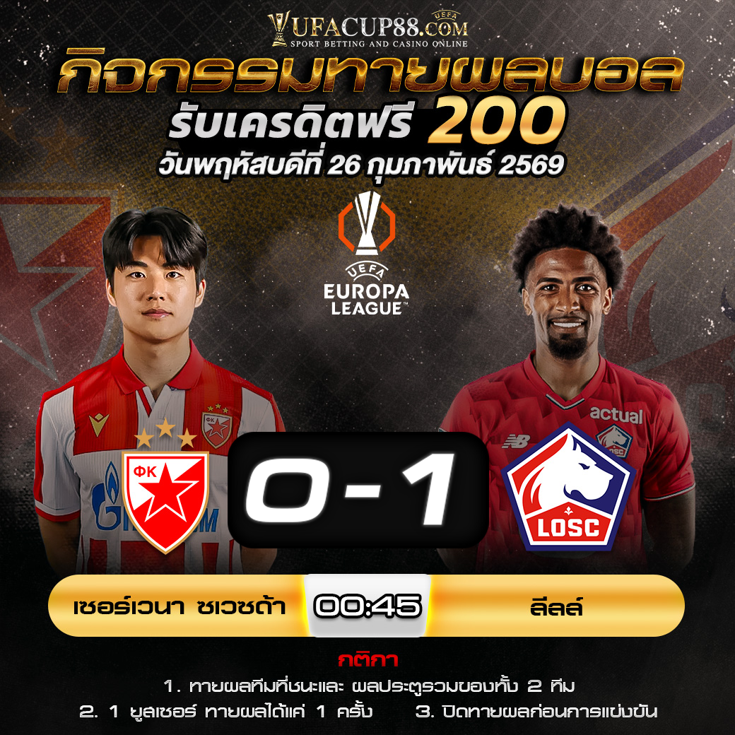 ประกาศกิจกรรมทายสกอร์รวมและทีมไหนจะชนะคู่ เซอร์เวน่า ซเวซด้า 0-1 ลีลล์ ประจำวันที่ 26 กุมภาพันธ์ 2569
