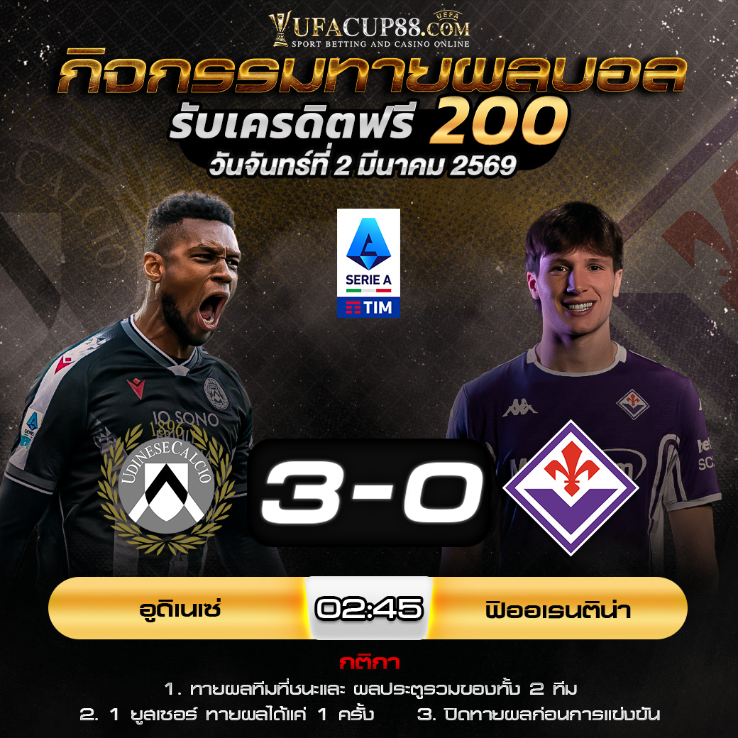 ประกาศกิจกรรมทายสกอร์รวมและทีมไหนจะชนะคู่ อูดิเนเซ่ 3-0 ฟิออเรนติน่า ประจำวันที่ 2 มีนาคม 2569