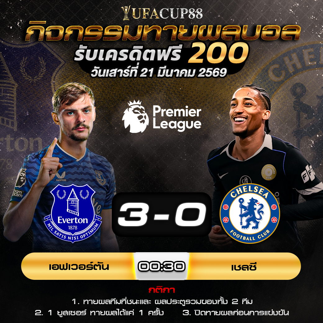 ประกาศกิจกรรมทายสกอร์รวมและทีมไหนจะชนะคู่ เอฟเวอร์ตัน 3-0 เชลซี ประจำวันที่ 21 มีนาคม 2569