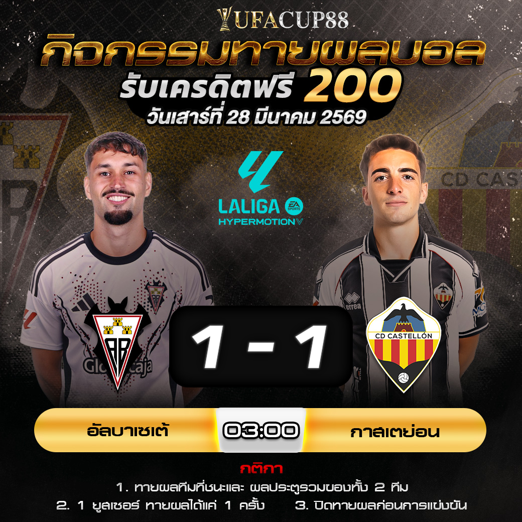 ประกาศกิจกรรมทายสกอร์รวมและทีมไหนจะชนะคู่ อัลบาเซเต้ 1-1 กาสเตย่อน ประจำวันที่ 28 มีนาคม 2569