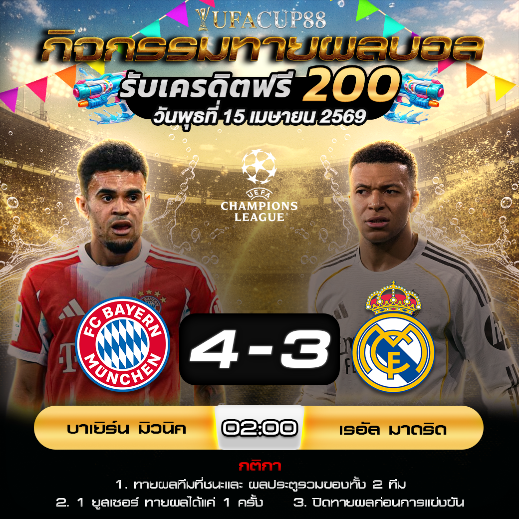 ประกาศกิจกรรมทายสกอร์รวมและทีมไหนจะชนะคู่ บาเยิร์น มิวนิค 4-3 เรอัล มาดริด ประจำวันที่ 15 เมษายน 2569