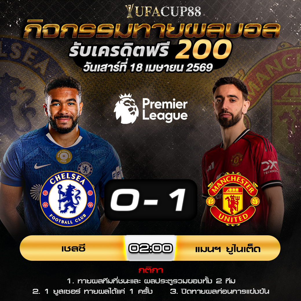 ประกาศกิจกรรมทายสกอร์รวมและทีมไหนจะชนะคู่ เชลซี 0-1 แมนฯ ยูไนเต็ด ประจำวันที่ 18 เมษายน 2569
