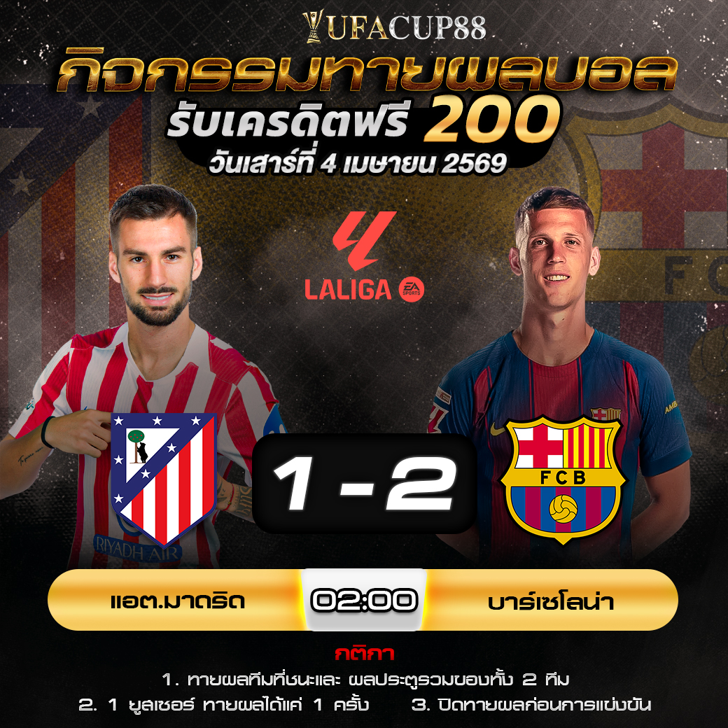 ประกาศกิจกรรมทายสกอร์รวมและทีมไหนจะชนะคู่ แอตฯ มาดริด 1-2 บาร์เซโลน่า ประจำวันที่ 4 เมษายน 2569