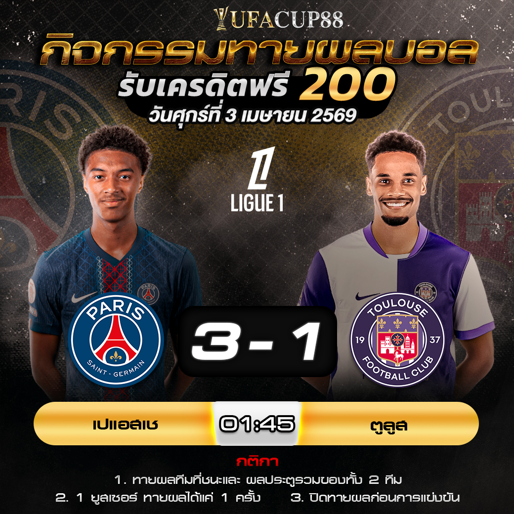ประกาศกิจกรรมทายสกอร์รวมและทีมไหนจะชนะคู่ เปแอสเช 3-1 ตูลูส ประจำวันที่ 3 เมษายน 2569