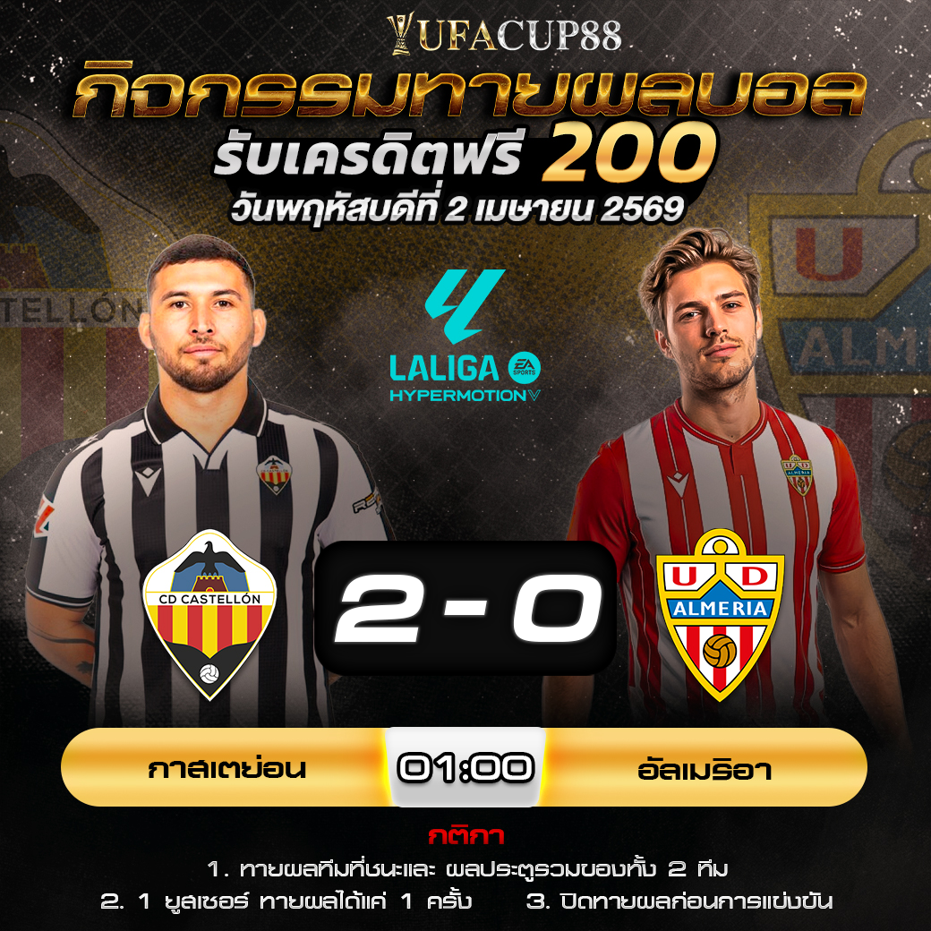 กิจกรรมทายสกอร์รวมและทีมไหนจะชนะคู่ กาสเตย่อน VS อัลเมริอา ประจำวันที่ 2 เมษายน 2569