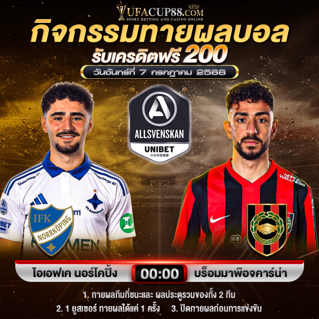 กิจกรรมทายสกอร์รวมและทีมไหนจะชนะคู่ ไอเอฟเค นอร์โคปิ้ง VS บร็อมมาพ็อจคาร์น่า ประจำวันที่ 07 กรกฎาคม 2568
