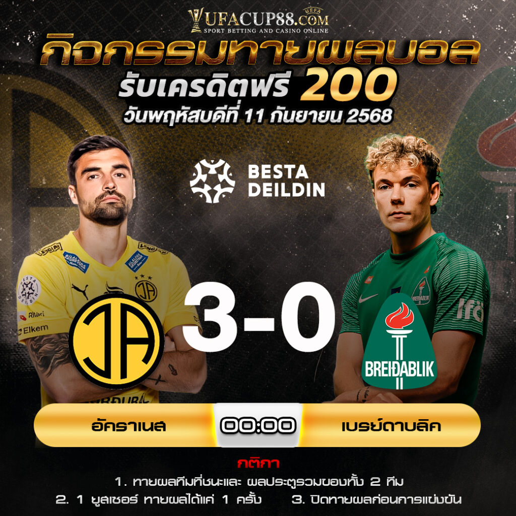 ประกาศกิจกรรมทายสกอร์รวมและทีมไหนจะชนะคู่ อัคราเนส 3-0 เบรย์ดาบลิค ประจำวันที่ 11 กันยายน 2568