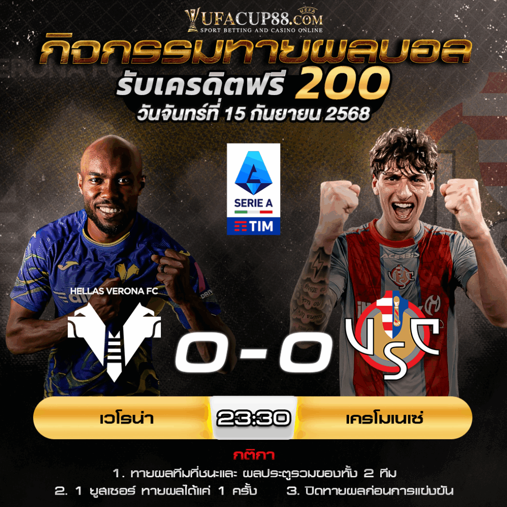 ประกาศกิจกรรมทายสกอร์รวมและทีมไหนจะชนะคู่ เวโรน่า 0-0 เครโมเนเซ่ ประจำวันที่ 15 กันยายน 2568