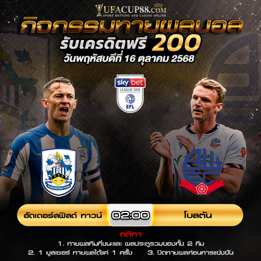 กิจกรรมทายสกอร์รวมและทีมไหนจะชนะคู่ ฮัดเดอร์สฟิลด์ ทาวน์ VS โบลตัน ประจำวันที่ 16 ตุลาคม 2568