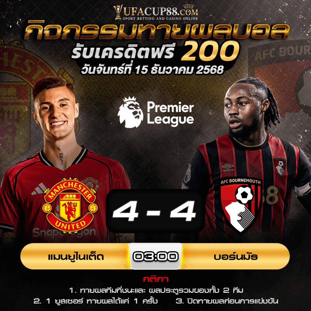 ประกาศผู้ชนะกิจกรรมประกาศกิจกรรมทายสกอร์รวมและทีมไหนจะชนะคู่ แมนฯ ยูไนเต็ด 4-4 บอร์นมัธ ประจำวันที่ 15 ธันวาคม 2568 ประกาศรายชื่อผู้โชคดี ผลการแข่งขัน เสมอ สกอร์ประตูรวม ทั้งหมด 8 ทำประตู รายชื่อสมาชิกที่ได้รับรางวัล 200.-ไม่มีสมาชิกทายถูกติดต่อรับรางวัลได้ที่ @VIP.C88 กิจกรรมทายสกอร์รวมและทีมไหนจะชนะคู่ แมนฯ ยูไนเต็ด VS บอร์นมัธ ประจำวันที่ 15 ธันวาคม 2568 กิจกรรมทายสกอร์รวมและทีมไหนจะชนะคู่ สปอร์ติ้ง กิฆ่อน VS บาเลนเซีย ประจำวันที่ 16 ธันวาคม 2568