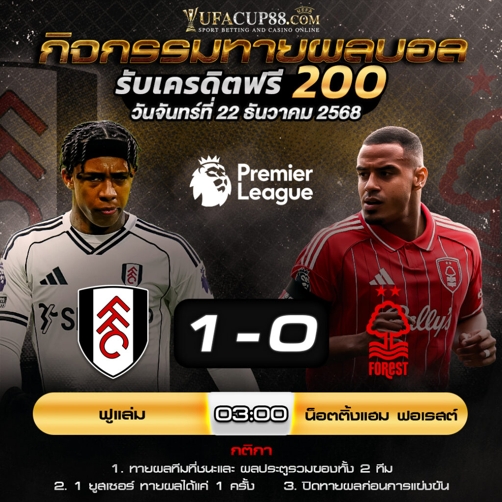 ประกาศกิจกรรมทายสกอร์รวมและทีมไหนจะชนะคู่ ฟูแล่ม 1-0 น็อตติ้งแฮม ฟอเรสต์ ประจำวันที่ 22 ธันวาคม 2568