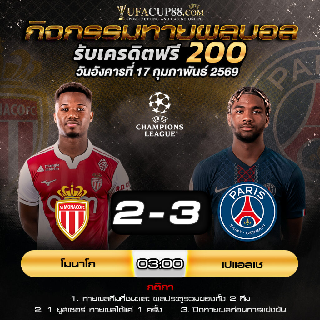 ประกาศกิจกรรมทายสกอร์รวมและทีมไหนจะชนะคู่ โมนาโก 2-3 เปแอสเช ประจำวันที่ 17 กุมภาพันธ์ 2569