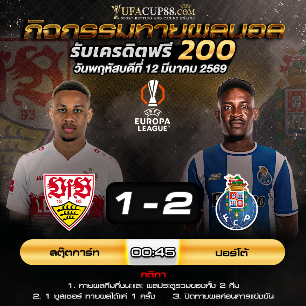 ประกาศกิจกรรมทายสกอร์รวมและทีมไหนจะชนะคู่ สตุ๊ตการ์ต 1-2 ปอร์โต้ ประจำวันที่ 12 มีนาคม 2569
